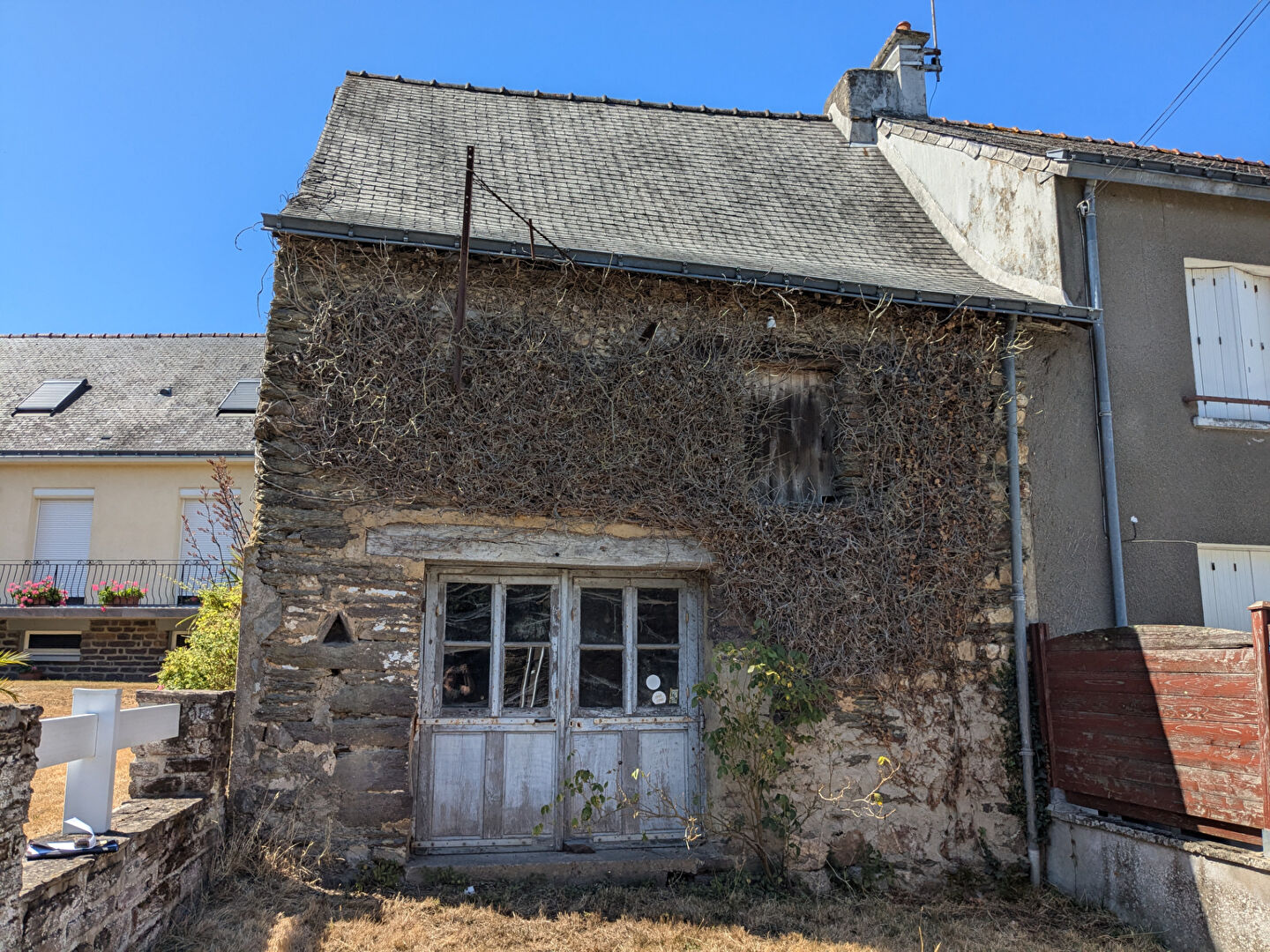 Near Guer and the RN 24, old barn used as a workshop for sale, built in stone and covered in fiber-cement slate, to renovate, offering a potential of 30 m² on the ground, to visit without delay. Land at the front. Low price. Work required.